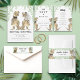 Fun Dinosaurier thematisierte Hochzeitsmenü mit lustigen Dinosaurier Braut und Bräutigam und Aquarell botanischen eucalyptus foliage. Einfach mit den Namen der Braut und der Bräuche, dem Hochzeitsdatum und allen Einzelheiten der Hochzeitsmenüs in der modernen Typografie-Skript anpassen. Fun T-Rex Braut und Bräutigam Dino Illustrationen in Brauntönen mit Aquarell in grünen Farbtönen. Originelle Dino-Kunstwerke der Künstlerin Catherine Sweetman