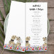 Freuen Sie sich auf dieses lustige Dinosaurier-Hochzeitsmenü mit lustiger T-Rex Braut und Bräutigam auf einer bunten prähistorischen Wildblume-Wiese. Einfach mit den Namen der Braut und der Bräuche, dem Hochzeitsdatum und allen Einzelheiten der Hochzeitsmenüs in der modernen Typografie-Skript anpassen. Fun Tyrannosaurus Rex Braut und Bräutigam Dino und Aquarell Blumenbilder in rosa lila-gelben Orange und Grün Farben. Originelle Dino-Kunstwerke der Künstlerin Catherine Sweetman