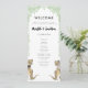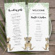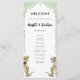 Funny Dinosaurier Thema Hochzeitstag Programm mit Spaß Dinosaurierbride und Bräutigam und Aquarell eucalyptus foliage. Einfach mit den Namen der Braut und der Bräuche, dem Hochzeitstag und allen Einzelheiten der Hochzeitstagsfeier in modernem Typografie-Skript anpassen. T-Rex Braut und Bräutigam Dino Illustrationen in braunen Tönen und botanischen Aquarellen in grünen Farbtönen. Originelle Dino-Kunstwerke der Künstlerin Catherine Sweetman