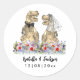 Fun Dinosaurier Braut und Bräutigam in einer schönen bunten Wildblume Wiese eine Dinosaurier Thema Hochzeit Aufkleber, um Ihre Gäste zu erfreuen. Einfach mit den Namen der Braut und der Bräuche und dem Hochzeitstermin in modernen Typografie-Skripten anpassen. Funny Tyrannosaurus Rex Braut und Bräutigam und Aquarellfarben Sommer Blumenbilder in lila blau rosa grün gelb und orange Farben. Einzigartiges originelles Dino- und Blumenwerk der Künstlerin Catherine Sweetman