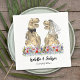 Ideal für eine Dinosaurier-Hochzeit, diese lustige Dinosaurier Braut und Bräutigam stehend in farbenfrohen Wildblumen Serviette wird Ihre Gäste begeistern. Einfach mit den Namen der Braut und der Bräuche und dem Hochzeitstermin in modernen Typografie-Skripten anpassen. Funny dino T-Rex dino Braut und Bräutigam und Aquarell Sommer Blumenbilder in lila blau rosa grün gelb und orange Farben. Einzigartiges originelles Dino- und Blumenwerk der Künstlerin Catherine Sweetman