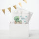 Dinosaurier Thema 1. Geburtstag Gastgeschenk Taschen haben einen niedlichen Triceratops Junge schlüpfen aus einem Ei mit blauen Dinosaurier Tracks. Ideal für Dino- und 'Wild One' Feiern. Kunst von KL Stock