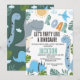 Dinosaure moderne 1er anniversaire Invitation Dinosaure doux thème 1er anniversaire invitation qui peut être édité pour tout âge avec un mot décoratif rugissant, divers dinosaures mignons en bleu et gris, un soleil et feuillage. Idéal pour tous ceux qui recherchent une invitation simple et moderne d'anniversaire dinosaure.