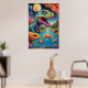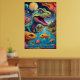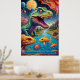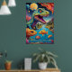 Dinosaure capricieux et vibrant qui semble être un mélange d'imaginaire et de charme préhistorique. Le dinosaure a un long cou et une grande tête, avec une expression aux yeux larges, avec des yeux surdimensionnés et captivants qui lui donnent un look mignon et curieux. Sa peau est ornée de motifs complexes ressemblant à des formes et des points colorés et tourbillonnants, comme si son corps était peint d'un kaléidoscope de textures dans les bleus, les verts, les jaunes et les violets. L'arrière - plan vibrant, avec ses cieux tourbillonnants et ses planètes abstraites, donne l'impression d'un paysage autrement mondain, suggérant que le dinosaure réside dans un monde surréaliste et fantastique. Les couleurs vives et exagérées et les traits ludiques confèrent à la créature un caractère convivial et animé, idéal pour un cadre magique ou onirique. Ce dinosaure pourrait appartenir à une espèce imaginaire d'un royaume cosmique, où la flore et la faune prospèrent dans des écosystèmes psychédéliques dynamiques, mêlant vie préhistorique et rebondissements spatiaux. Son comportement exsude l’innocence et de l’émerveillement, comme s’il explorait pour la première fois son univers fantastique.