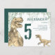 Roaring T-Rex und Velociraptor Dinosaurier fünften Geburtstagsfeier Einladung mit Dschungelblättern und grüner moderner Typografie. Dino-Fans vor allem Jungs werden diese braune und grüne prähistorische Thema 5. Geburtstagsparty einladen. Einfach zu personalisieren mit dem Namen des Geburtstagsjungen oder -mädchens, der Geburtstagsnummer und den Party Details. Sie sind alle Set für einen lustigen Dinosaurier Dschungel zum Geburtstag. Alle Dinosaurier-Arten sind willkommen. Prähistorische jurassische Ära Dinosaurier-Illustrationen, Original-Kunstwerk von Catherine Sweetman