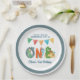 Moderne Dinosaur Erste Geburtstagsparty Teller. Dieses Design bietet Typografie Skript ONE mit Dinosauriern und danke Ihnen für das Fest mit uns Nachricht. Personalisieren Sie weiter mit einem Namen.