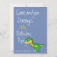 Dinosaurier sind zurück. Die Jurassischen Kreaturen feiern wieder einen niedlichen Geburtstag. Der Dinosaurier ist grün und gelb und hat einen blauen Hintergrund. Der Text ist in einer lustigen jungen Typografie . Das Alter kann für jedes Alter geändert werden, und der Text kann geändert werden, um Ihre Veranstaltung und Informationen widerzuspiegeln. Die Rückseite hat ein Muster von Dinosauriern auf grünem Hintergrund. Der gesamte Text kann an Ihre Informationen angepasst werden