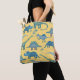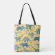 Viele blaue Dinosaurier, Tyrannosaurus rex, Spinosaurus, Stegosaurus, Diplodocus und Triceratops auf sonniger gelber Basis. Originelle Kunst von Nic Squirrell.