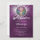 Eine mädchenhafte und weibliche 18. (oder jedes Alter) Party Einladung. Eine lila Hintergrundfarbe. Die lila Farbe ist ungleichmäßig. Dekoriert mit einer farbenfrohen Diskothek. Text: Lasst uns Party machen! Personalisieren und fügen Sie einen Namen und Party-Details hinzu. Der Name wird mit einem handgeschriebenen Stilskript geschrieben.