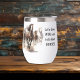 Ce verre à vin a une jolie aquarelle de chevaux en course. Le texte gris charbon à côté de l'image dit "Buvons du vin et parlons de CHEVAUX". Un côté a aussi votre nom ou monogramme en gris assorti.