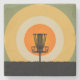 Dieses Grafikdesign zeichnet sich durch farbenfrohe Ringe rund um einen Silhouette-Scheibengolfkorb und Gras aus.