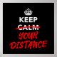 Ein sozialer distanzierender Slogan, der eine lustige Drehung über "Keep Calm and Carry On" ... Behalt Deine Distanz ist eine nicht so subtile Erinnerung, um jeden Safe behalten.