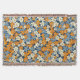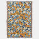 Ein lebendiges Blumenmuster bedeckt das gesamte Bild. Kleine, stilisierte Blume in Orange-, Hellblau- und Cremetönen sind dicht auf marineblau gehalten. Die Blume haben ein etwas unvollkommenes, malerisches Aussehen, mit Variationen in Farbsättigung und Form, die dem Muster ein strukturiertes, fast handgemaltes Aussehen verleihen. Das wiederholte Muster erzeugt einen fröhlichen und geschäftigen visuellen Effekt.