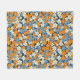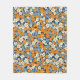 Ein lebendiges Blumenmuster bedeckt das gesamte Bild. Kleine, stilisierte Blume in Orange-, Hellblau- und Cremetönen sind dicht auf marineblau gehalten. Die Blume haben ein etwas unvollkommenes, malerisches Aussehen, mit Variationen in Farbsättigung und Form, die dem Muster ein strukturiertes, fast handgemaltes Aussehen verleihen. Das wiederholte Muster erzeugt einen fröhlichen und geschäftigen visuellen Effekt.