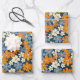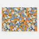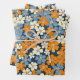 Ein lebendiges Blumenmuster bedeckt das gesamte Bild. Kleine, stilisierte Blume in Orange-, Hellblau- und Cremetönen sind dicht auf marineblau gehalten. Die Blume haben ein etwas unvollkommenes, malerisches Aussehen, mit Variationen in Farbsättigung und Form, die dem Muster ein strukturiertes, fast handgemaltes Aussehen verleihen. Das wiederholte Muster erzeugt einen fröhlichen und geschäftigen visuellen Effekt.