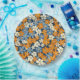 Ein lebendiges Blumenmuster bedeckt das gesamte Bild. Kleine, stilisierte Blume in Orange-, Hellblau- und Cremetönen sind dicht auf marineblau gehalten. Die Blume haben ein etwas unvollkommenes, malerisches Aussehen, mit Variationen in Farbsättigung und Form, die dem Muster ein strukturiertes, fast handgemaltes Aussehen verleihen. Das wiederholte Muster erzeugt einen fröhlichen und geschäftigen visuellen Effekt.