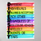 DIVERSITÉ - Différentes personnes se valorisant et s'acceptant indépendamment de : couleur de peau, sexe, intellect, talents ou années Poster à utiliser dans une classe, un bureau de conseillers scolaires, un bureau scolaire, un bureau de thérapeutes pour enfants, un bureau de psychologues scolaires, un bureau de travailleurs sociaux, un bureau de travailleurs sociaux scolaires ou un bureau de psychologues pour enfants. Cette affiche est également très intéressante pour la décoration des chambres d'ados ou du collège et comme motivation, gentillesse, art anti-intimidation dans les salles de classe de tous âges ! Un décor artistique inspirant et inspirant. Un grand graphisme coloré et accrocheur qui captera l'attention des enfants et leur rappellera la diversité est quelque chose à célébrer! Couleurs vives contre un arrière - plan d'eau arc-en-ciel.