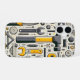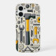 Eine lebhafte Auswahl an Werkzeugen und Hardware ist sorgfältig arrangiert, mit einem Hammer, Armbrüsten und Sägen, die farblich in einem fesselnden Muster illustriert sind