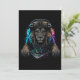 ein Tier, das Kopfhörer trägt und Musik-Mixer hält, das Gesicht des Löwen nah