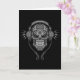 Ein aufwändiges DJ-Design mit Zuckerschädeln, das mit aufwändigen Wirbel und Punktmuster dekoriert ist. Kopfhörer sitzen oben auf dem Schädel und zwei Drähte hängen darunter. Die komplexen Linien und Kreise sind schwarz, während das Innere des Schädels mit hervorgehobenen Grautönen abgeschlossen ist. Musik strahlt aus den Kopfhörern in Form von grauen Blitzschrauben und dem reinen schwarzen Hintergrund. Dieser aggressive Tag des Toten inspiriert Bilds macht eine auffallende Karte