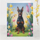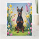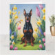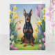 Ein fröhlicher Hund sitzt friedlich auf üppig grünem Gras, umgeben von bunten Frühlingsblüten unter einem weichen blauen Himmel. Dieses digitale Ölgemälde erfasst einen ruhigen Moment mit ausdrucksvollen Pinselstrichen, warmen Farben und einem Gefühl sanfter Freude.
