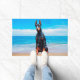 Ein niedlicher Doberman Hund sitzend mit farbenprächtigem Hintergrund, eine Geschenkidee für jemanden, der diesen Hund züchtet.