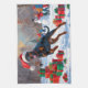 Ein schlanker Doberman läuft kräftig durch die schneebedeckte Winterszene und trägt einen festlichen roten Weihnachtshut. Dieses auffallende Design hebt das sportliche Gebilde der Rasse, die loyale Natur und die gefühlvolle Persönlichkeit hervor und erweckt gleichzeitig die Wärme und den Zauber der Urlaubssaison. Ein kühner Winterurlaub voller festlichen Charme.