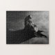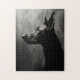 Ein schwarzer Doberman Pinscher steht im Profil vor einem dunklen, rauchigen Hintergrund. Der Kopf des Hundes ist leicht nach oben geneigt, seine großen Ohren perkierten, und sein Blick richtete sich auf etwas außerhalb der Kamera. Das Bild wird in Schwarz und Weiß gedreht und schafft eine dramatische und geheimnisvolle Atmosphäre. Der Rauch verleiht dem Hund ein Gefühl von Tiefe und Intrige, während die Silhouette des Hundes sich vor dem unangenehmen Hintergrund deutlich abhebt.