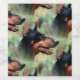 Leichter Cartoon-Effekt auf das Bild eines Doberman Pinscher Hundes mit zugeschnittenen Ohren vor einem holzgrünen Hintergrund. Ideal für den Dobermann Hundeliebhaber in Ihnen!