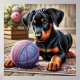 Ein niedlicher Doberman Welpe, der mit einem bunten Garnball auf einem gemusterten Teppich spielt. Die Szene strahlt Wärme und Charme aus und zeigt einen spielerischen Moment in einem gemütlichen häuslichen Ambiente.