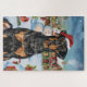 Dieses festliche Design spiegelt den fröhlichen Geist der Urlaubssaison wider und besticht durch ein hübsches Jungtier mit einer Weihnachtsmannmütze. Der Hund ist eingebettet in ein winterliches Wunderland, mit einem Schneemann, einem dekorierten Weihnachtsbaum und wunderschön verpackten Geschenken. Schneeflocken fallen sanft ab und geben der Szene eine magische Touch, während die lebhaften Farben der Feriendekorationen eine warme und fröhliche Atmosphäre schaffen.