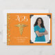 Célébrez le nouveau docteur en médecine diplômé de l'école de médecine avec cet or et Orange faire-part de graduation de médecine caducée! Elégant avec une bordure photo vintage et des accents de confettis dorés ! Idéal pour toute personne diplômée en tant que médecin ou ayant un doctorat !