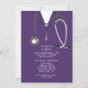 Creative medical school graduation party invites featuring purple hospital scrubs and stethoscope art. Edit text to create unique doctor party invitation.