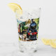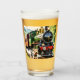 A nostalgic scene of a dog greeting the arrival of a green steam train.