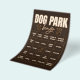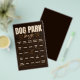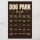 A playful, earth-toned bingo card design featuring 25 common dog behaviors like "Zoomies" and "Wagging Tail." The graphic uses a mix of bold block lettering and elegant script, accented by bone icons and a minimalist dog silhouette.