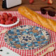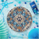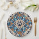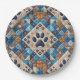 Ein geometrisches Muster beinhaltet große und kleine Hundepapierabdrücke, die in einem symmetrischen und farbenfrohen Quiltdesign angeordnet sind.
