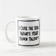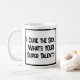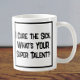 Ein lustiger Slogan auf einer Tasse, die sagt: "Ich heile den Kranken. Was ist IHR super Talent?" Medizinische Tasse. Tasse für einen Arzt oder Arzt. Schwarzweißtext.