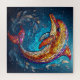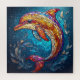 Ein farbenfroh farbiges Glaskunstwerk, das einen lebendigen Delphin darstellt, umgeben von einer Mischung aus Wasserelementen und ätherisch-blauen Hintergrund.