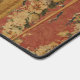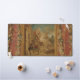 The central scene is ordered by an ornate gold frame, and garland of white and red flowers with an intricate floral red background. A peacock is perched at the top of the frame.