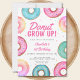 Prévoyez-vous une fête d'anniversaire pour une fille ? Cette Invitation de 1er Anniversaire de Donut est décorée de beignets aquarelle dans les tons rose et aqua. Il dit "Croissance des beignets" dans la typographie stylisée. Il a un motif en beignet sur le dos. Facile à personnaliser. Aquarelle originale © Michele Davies.