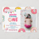 Cette douce invitation d'anniversaire Sweet One personnalisée avec vous photo présente mes beignets dessinés à la main dans des couleurs vives avec des confettis saupoudrés.