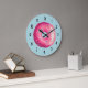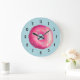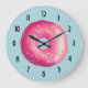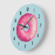 A delicious looking clock with a yummy illustration of a pink frosted donut with colorful sprinkles. Set on a retro blue colored background.