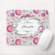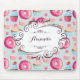 Ein süß und skurril personalisiertes Mousepad. Design. Glasierte rosa Donuts mit Sprinklen. Mundgießen in Rosa und Blau mit Rosetten und Erdbeeren. Ein pastellrosa, französisches Gebäck mit Makaronen und kleinen rosafarbenen Knöpfen schmücken dieses Muster mit süßen Leckereien. In der Mitte ein extravaganter skurriler Rahmen mit handgezeichnetem Blick darauf. Personalisieren Sie das Zentrum mit einem Namen.