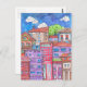 Doodle Stadt. Handgezeichnete Häuser und Bäume, blauer Himmel und Wolken. Aquarellbild.