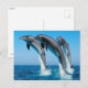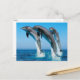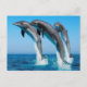 Tierkarte mit drei wunderschönen verspielten Delphinen, die aus dem Wasser springen.
