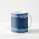 Blauer Jeans Stoff Rahmen. Bleichte Denim-Gewebe mit Randstreifen auf blauem Denim-Hintergrund, Textstelle, Kopierraum. Worn Jeans Lässige Doppelfarben-Patch Jeans Stoffrahmen in lässigem blauen Chic. Bleichdenim mit Randstreifen für diese einmalige Touch. Mit diesem blauen Stoffrahmen schaffen Sie stilvolle Denim-Villen. Doppel der Denim, doppelt der Spaß! Denim, Textur, Patchwork, gewürfelt, Muster, Hintergrund, Dekoration, Rahmen, Vintag, blau, Stoff, alt, Kleidung, Textil, Baumwolle, Leinwand, Stoff, Faser, Bekleidung