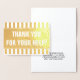 Cette carte de remerciement en feuille d'or qui attire l'attention et qui affiche un message de MERCI pour VOTRE AIDE! sur le devant, ainsi qu'un message personnalisable à l'intérieur. Il pourrait être utilisé pour témoigner de l'appréciation à quelqu'un qui a assisté à un mariage, à des funérailles, à un diplôme ou à un autre événement.