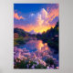 Tauchen Sie ein in die ruhige Schönheit dieses atemberaubenden Digitaldrucks mit einem alten, ruhigen Dorf am Ufer eines ruhigen Sees. Das warme orangefarbene Licht der untergehenden Sonne strahlt eine schöne hellrosa Farbe über die Landschaft und schafft ein Gefühl der Ruhe und Gelassenheit.