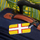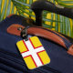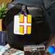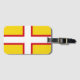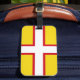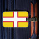 Gepäckmarke mit Design mit einer Fahne des historischen Landkreises Dorset in England, Großbritannien; gelbe Fahne mit weißem Kreuz mit roter Grenze