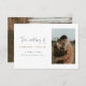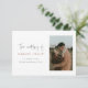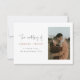 Élégant minimaliste simple Faire-part de mariage photo. Ce design raffiné comprend une seule photo sur la gauche, magnifiquement équilibrée avec une typographie moderne et minimale sur la droite. La disposition propre comprend de l’espace pour un message personnel, votre date de mariage et votre emplacement, tandis que les noms du couple sont élégamment signés dans un style manuscrit, ajoutant une touche personnelle et romantique. Le dos a de la place pour une autre photo de couverture complète.